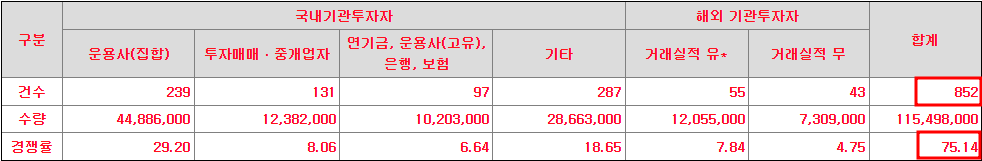기관 수요예측 경쟁률은 75:1이며, 참여기관은 852개의 기관이 참여했습니다.