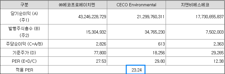 비교기업인은 에코프로에이치엔, 지앤비에스에코, 해외 기업인 CECO Environmental은 투자설명서가 나왔을 때 기업의 평균 PER은 23.24배였으나, 23년 11월 09 일 종가기준으로 해외기업을 제외한 평균 PER은 15.67배였습니다. 에코아이의 확정공모가 34,700원에 따른 PER은 19.63배로 비교기업에 비해 4.35배 높게 평가된 상황입니다. 공모가가 고평가 된 것으로 보이며 수요예측 결과도 낮아 투자할 가치가 낮아 보입니다. 청약 말고 상장 이후에 기업 가치를 보고 투자하는 것이 더 현명해 보입니다.