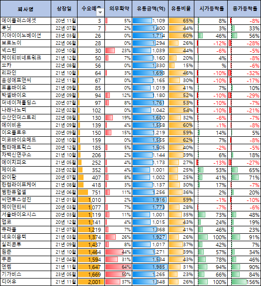 유통가능 물량은 33.9%이며 1%이상 주주가 8.06%, 기타소액주주 4.84%, 공모주주 21.01%가 상장일 매도 할수 있습니다. 희망공모가 상단기준 유통가능 금액은 1,262억 원입니다.