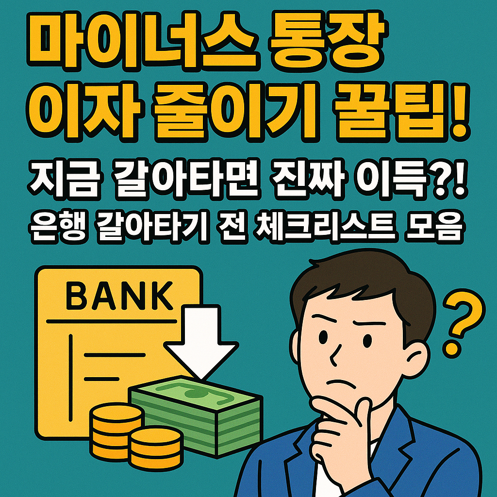 은행에 한 번 뚫린 마이너스 통장,그냥 써도 되겠지~ 하다가 이자만 줄줄 새는 경우 진짜 많슴미다 ㅠㅠ최근 이자율 많이 떨어졌는데… 내 건 그대로다? 그럼 바꿔야쥬…저도 처음엔 이거 귀찮아서 안 했는데,갈아타고 나니까 월 이자만 몇 만원 차이 나더라구요 ㅋㅋ오늘은 마이너스 통장 ‘갈아타기’ 완전 쉽고 실속있게 알려드릴게요!이거 아셨나요?마이너스 통장도 갈아탈 수 있고요,심지어 이자율 낮은 상품으로 옮기면 진짜 실속 챙길 수 있다는 거!하지만 갈아타는 방법도 좀 꼼꼼히 따져봐야겠죠?기존 통장 해지 조건, 신용점수 영향, 신규 조건 등등 복잡할 수 있음다.그래서 오늘은마이너스 통장을 왜 갈아타야 하는지갈아탈 때 체크해야 할 5가지갈아타기 좋은 은행 조건 이렇게 핵심만 콕콕 알려드릴게요!알아두면 무조건 도움 ..