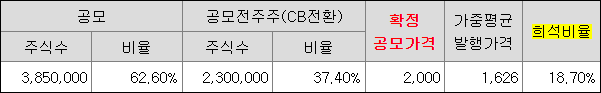 발기인 주식과 전환사채의 주식을 합쳐 2,300,000주가 1,000원으로 발행되었고 이는 총 발행주식 (6,150,000주)의 37.4%에 해당합니다. 공모전 발행 주식은 공모로 발행될 3,850,000주의 가격(2,000원)을 떨어뜨리는 요인이 되어 실질적인 발행가격을 18.7% 하락한 1,626원이 되었습니다. 공모주 투자자들은 기존 주주들이 싼 가격으로 보유하고 있는 주식으로 인해 공모주의 가치가 얼마나 하락되었는지를 나타 내는 지표를 희석비율이라 합니다. 희석비율은 낮을수록 공모투자자에게 유리합니다.