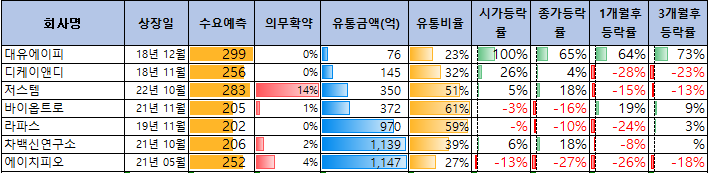 2018년부터 2023년까지 수요예측 결과값이 200대를 기록했던 공모주의 상장일 수익률을 살펴보면 유통금액이 350억이 안 되는 대유에이피 외 이케이앤디, 저스템이 상장일에 수익을 주었으며, 바이옵트로, 라파스 에이치피오는 마이너스 수익을 보여 주었습니다. 차백신연구소는  1000억 원 이상의 유통금액이었으나 예상외로 상장일에 6~18% 수익을 주었습니다.