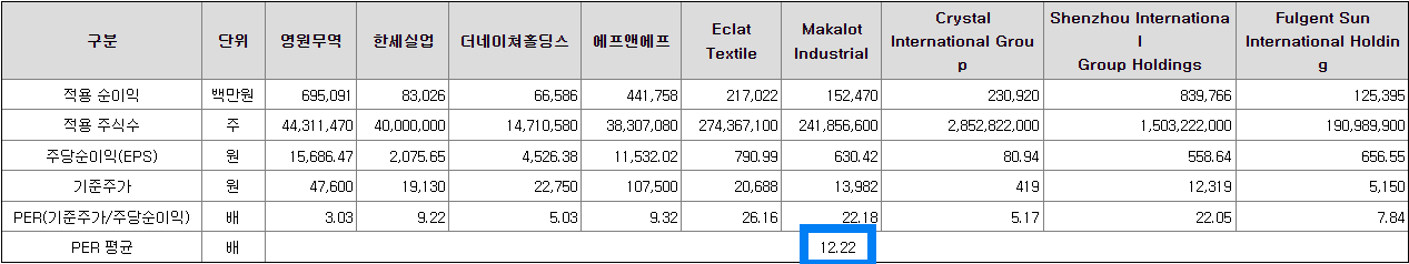 비교기업인은 4개의 국내기업과 5개의 해외기업을 대상으로 평균 PER을 구했을 때 12.22배가 나왔습니다. 해외기업은 알수 없으니 제외하고 국내기업인 영원무역, 한세실업, 네이쳐홀딩스, F&F의 평균을 PER를 구해보면 6.86배입니다. 그러나 동인기연의 확정공모가로 구한 PER은 7.18배입니다. 비교기업의 PER보다 0.32배 높은 상황입니다.