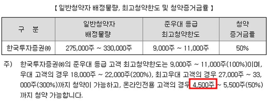 한국투자증권의 일반고객의 청약한도는 4,500주이며 희망공모가 상단기준 증거금으로는 58.5백만원입니다.