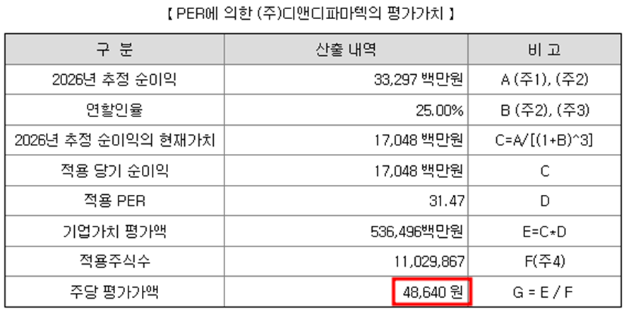 2026년 추정순이익 332억원에 연할인율 25%를 적용하여 현재가치로 환산하면 170억원입니다. 이를 비교기업의 평균PER에 곱하면 기업가치는 5364억원이 되며 이를 주식수로 나눠 주당 평가가액은 48,640원이 됩니다.