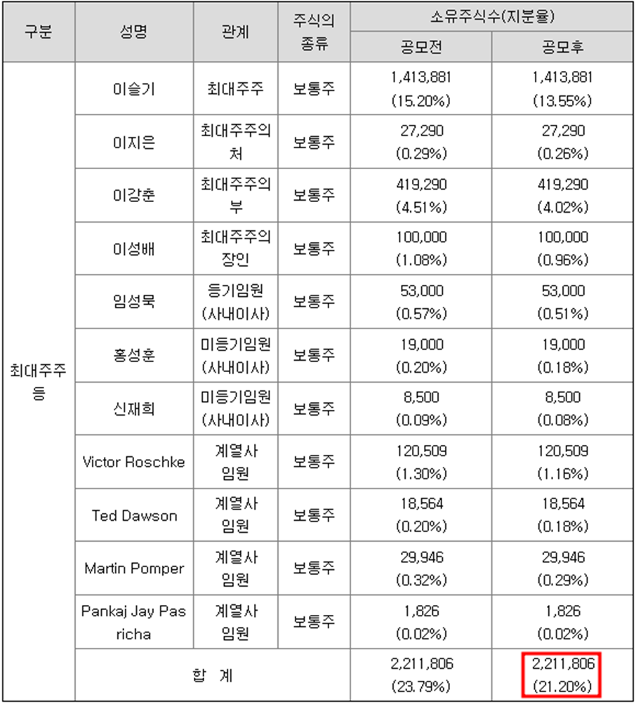 최대주주는 개인이며 약21.2% 지분을 가지고 있습니다. 최대주주가 상장기업인 경우 공모주의 기대감에 따라 최대주주의 주가가 급격히 상승하는 경우가 있습니다 필옵틱스와 LS머티리얼즈 상장 사례에서 확인할 수 있습니다. 최대주주가 상장기업인 경우 모기업의 주가상승에서도 수익을 낼 수 있으니 잘 살펴보시기 바랍니다.