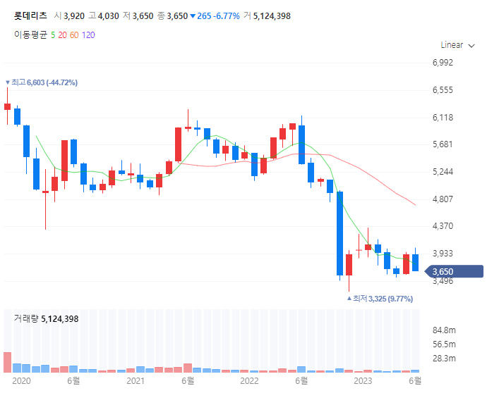 상장 이후 최저수준의 주가를 보여 주고 있습니다. 공모가 5,000원으로 시작했는데 지금은 3,650원입니다. 27% 하락했습니다. 매출과 순이익이 급격히 줄지 않았음에도 시장환경에 주가가 떨어졌습니다. 임차인인 롯데쇼핑의 지속된 적자도 한몫했을지 모르겠네요, 롯데쇼핑은 다행히 23년 1분기 흑자로 돌아 섰습니다. 올해 끝까지 가봐야 알겠지만, 코로나 팬데믹이 끝났고 시장도 바닥을 다지고 있으니 이제 곧 반등이 오지 않을까요? 국내 2번째 자산규모를 가진 리츠(1위는 SK리츠)가 더 떨어지기는 쉽지 않아 보입니다.