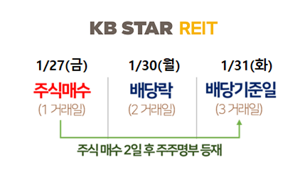 KB스타리츠를 예를 들어보겠습니다. KB스타리츠는 1월과 7월이 결산월입니다. 배당을 받기 위해서는 배당기준일(결산월 마지막날)에 주주명부에 등재되어야 합니다. 주주명부에 등재되기 위해서는 배당기준일 이틀 전에 주식을 매수해야만 합니다.