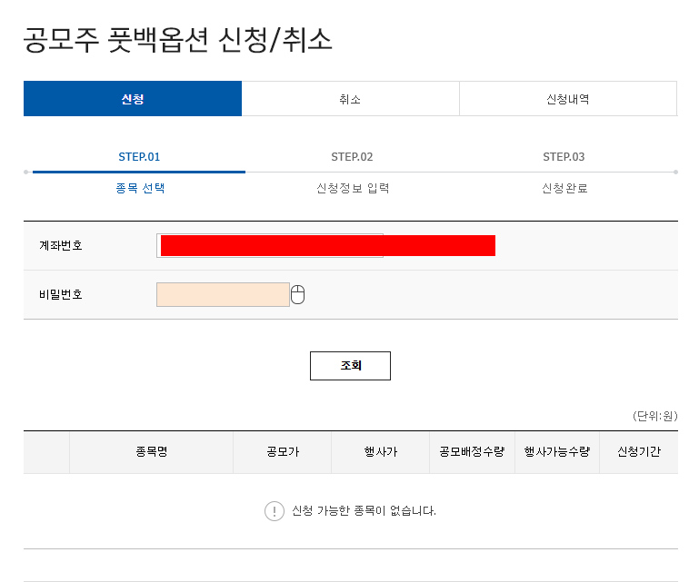 해당 화면에서 본인의 계좌번호와 비밀번호를 입력하고 '조회' 버튼을 클릭합니다. 그러면 환매청구권 행사가 가능한 종목 목록이 나타납니다. 이 중에서 환매를 원하는 종목을 선택합니다.