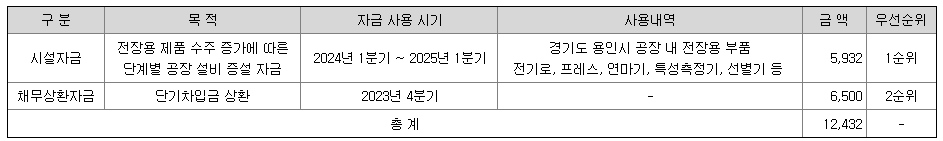 - 투자 계획: *2023년부터 2025년까지 단계적인 설비 증설, * 150톤 프레스, 50톤 프레스, 성형배열기 등 다양한 기계장치 도입 *추가적인 건축공사를 포함한 전체적인 공장 레이아웃 변경
