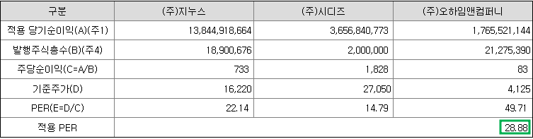 비교기업인은 지누스, 시디즈, 오하임앤컴퍼니 입니다. 투자설명서가 나왔을 때 비교기업의 평균 PER은 28.8배였으나, 24년 1월 24일 종가기준으로 평균 PER은 24.4배로 낮아졌습니다. 스튜디오삼익의 확정공모가 18,000원에 따른 PER은 24.4배로 비교기업에 비해 0.9배 낮게 평가된 상황입니다.