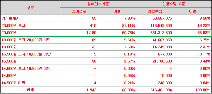 기관의 수요예측 신청가격 분포를 살펴보면 신청수량 기준으로 20,000원이 58.62%로 가장 많았으며 20,000원 초과가 19.62%로 두번째로 많았습니다.