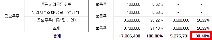 유통가능 물량은 30.48%이며 기준주주 10.26%, 공모주주 20.22%가 유통가능합니다. 금액으로는 369억입니다. 유통가능금액이300억대로 낮으며 기관의 의무확약이 들어온다면 더 줄어들 수 있습니다.