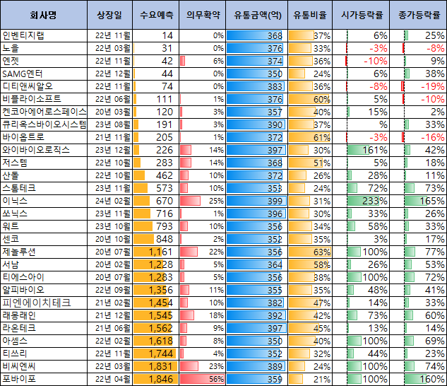 | 종목명 | 기관 경쟁률 | 의무확약 |