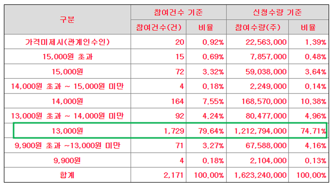 기관의 수요예측 신청가격 분포를 살펴보면 신청수량 기준으로 13,000원이 74.7%로 가장 많았으며 두번째로 14,000원이 10.3%로 많았습니다.