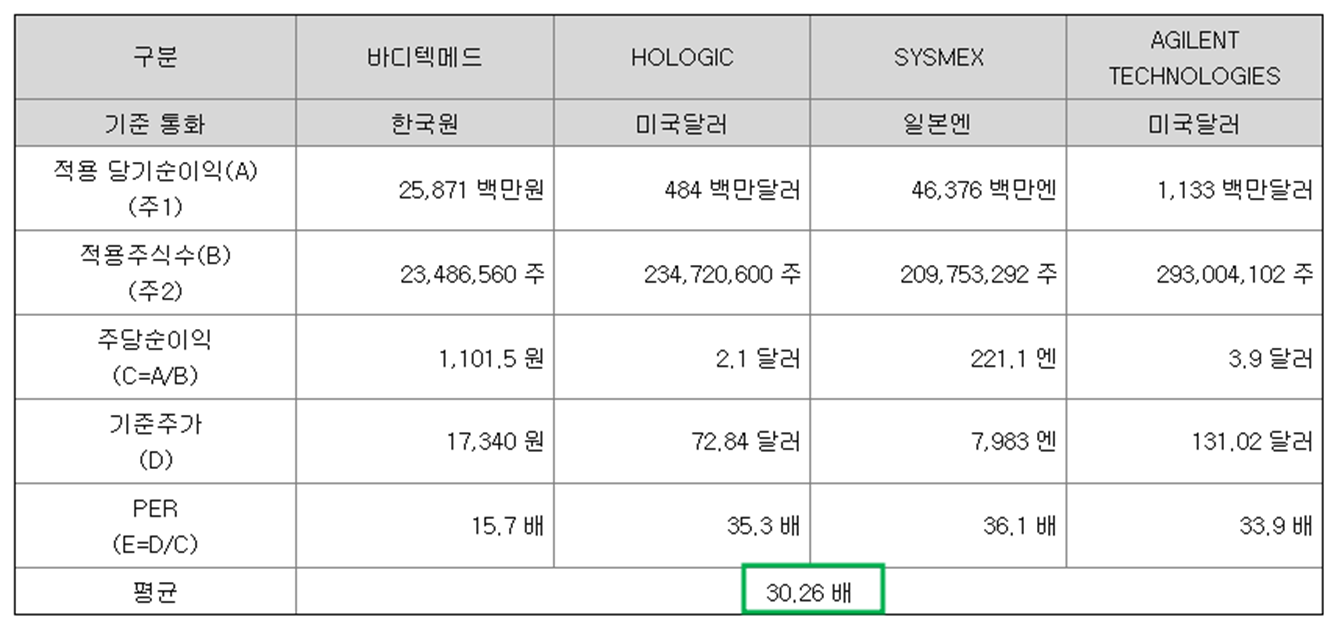 비교기업은 바디텍메드과 해외기업3개 입니다. 투자설명서가 나왔을 때 국내기업인 바디텍메드 PER은 15.7배였습니다. 24년 3월 22일 종가기준으로 PER은 13.8배입니다. 아이엠비디엑스의 확정공모가 13,000원에 따른 PER은 29.3배로 비교기업에 비해 16.32배 낮게 높게 평가된 상황입니다.