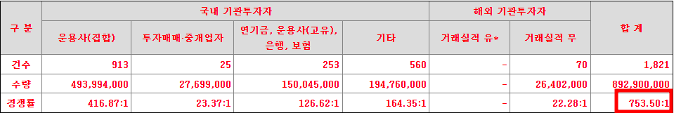 기관 수요예측 결과는 753:1이 나왔습니다.