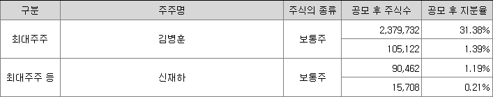 최대주주는 개인이며 최대주주등을 모두 포함해 약35% 지분을 가지고 있습니다. 최대주주가 상장기업인 경우 공모주의 기대감에 따라 최대주주의 주가가 급격히 상승하는 경우가 있습니다 필옵틱스와 LS머티리얼즈 상장 사례에서 확인할 수 있습니다. 최대주주가 상장기업인 경우 모기업의 주가상승에서도 수익을 낼 수 있으니 잘 살펴보시기 바랍니다.