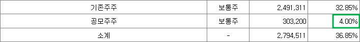 유통가능 물량은 36.8%이며 기존주주  35.85%, 공모주주 4.0%가 있습니다. 희망공모가 상단기준 유통가능 금액은 억 5589원입니다.