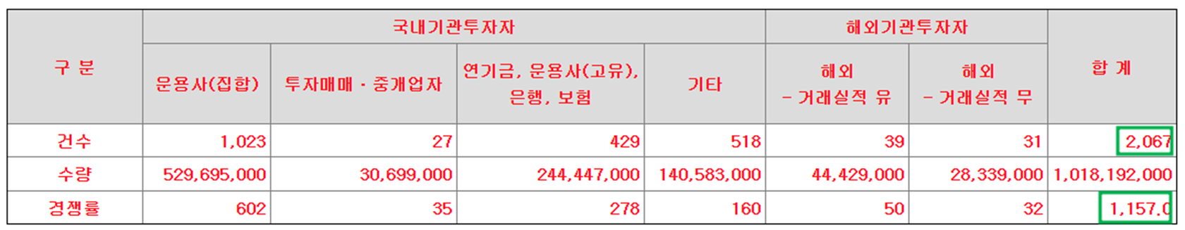 기관 수요예측 경쟁률은 2,067:1이며, 참여기관은 2,067개의 기관이 참여했습니다.