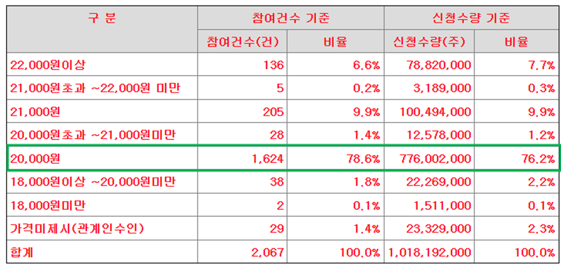기관의 수요예측 신청가격 분포를 살펴보면 신청수량 기준으로 20,000원이 76.2%로 가장 많았으며 두번째로 21,000원이 9.9%로 많았습니다.