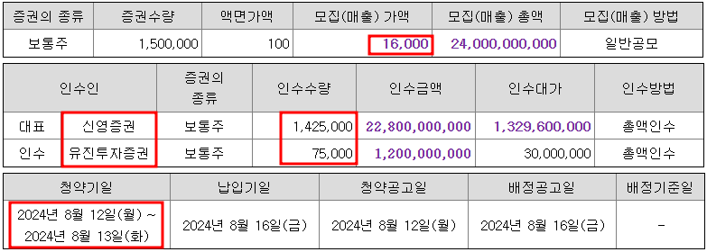 - 주관사 : 신영증권(95%), 유진증권(5%)