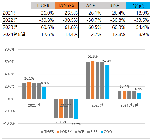 QQQ와 비교했을 때도 수익률이 더 높았고 국내 다른 운용사의 ETF와 비교했을 때도 연간 1%이내로 높은 수익률을 보여줬습니다. 물론 다른 ETF는 분배금이 있기 때문에 그 금액을 합치면 비슷한 수익률이 나올것입니다.