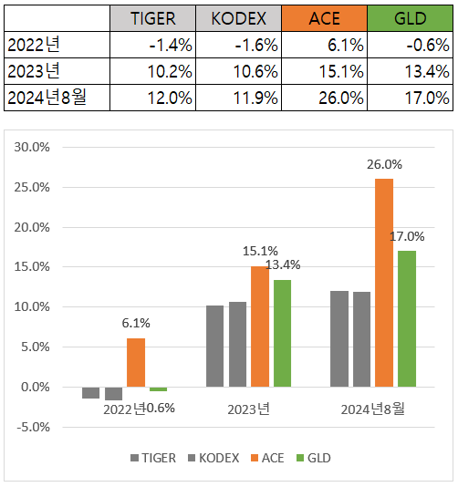 미국에 상장된 GLD ETF와 환헤지된 TIGER, KODEX ETF의 연간 수익률을 비교해보니 22년에는 1%, 23년에는 3%, 24년8월까지는 5%차이가 발생한 것을 확인할 수 있습니다. 수수료와 환헤지 비용으로 인해 수익률의 차이가 발생 한 것으로 보입니다. 반면 ACE 금현물 ETF는 GLD ETF보다 연수익률이 매년 높았음을 확인할 수 있습니다. 환율에 노출되어 있어 경제 위기 때마다 환율이 상승하고 금가격이 상승해 GLD ETE보다 수익률이 좋았습니다.
