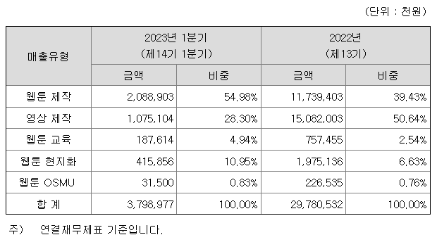 - 웹툰제작 : 웹툰의 제작공정은 기획-콘티-스케치-펜터치-채색-완성고의 과정을 거치는데 이런 과정을 전부문 내재화하고 고도화한 '스튜디오' 중심의 웹툰을 제작하고 있습니다. 또한 다수의 웹툰 IP를 연계한 세계관 스토리텔링을 전개하여 제작하고 있습니다.