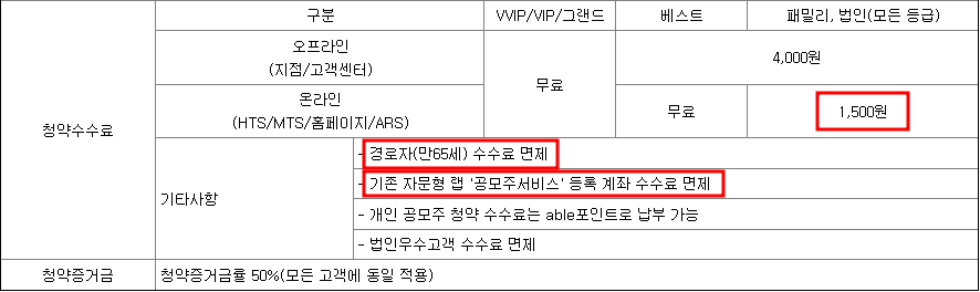 KB증권 청약수수료는 1,500원입니다. 만65세 이상인 경우 수수료가 면제되며 기존 자문형 랩'공모주서비스' 등록 계좌도 수수료 면제 됩니다.