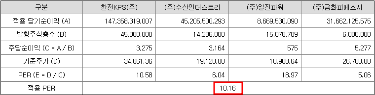 우진엔텍의 비교기업은 한전KPS, 수산인더스트리, 일진파워, 금화피에스시를 선택했으며 비교기업의 평균 PER은 10.16배입니다.