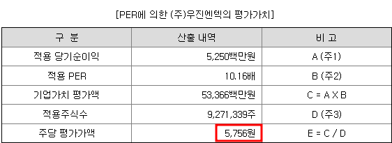 최근 4분기의 당기순이익은 5,250백만원이며 이를 비교기업의 평균PER인 10.16배를 곱해 기업의 가치를 구했으며 이를 적용주식수를 나눠 주당 평가가액 5,756원을 구했습니다.