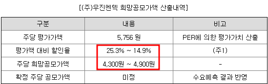 주당 평가가액에 할인율(25.3%~14.9%)을 적용해 희망공모가 4,300원 ~ 4,900원이 책정되었습니다.