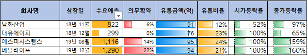 2018년 11월부터 우진엔텍과 비슷한 유통금액(100억이하)의 공모주의 상장일 성과를 살펴보면 총4종목이 있었으며 상장일 모두 수익을 주었습니다. 유통금액이 작은 공모주는 상승하는 확률이 높으므로 청약에 참여하셔서 수익 내시기 바라겠습니다.