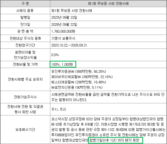 전환사채 발행현황은 1,760,000주이며 유진투자증권(990백만원, 56.25%), 제이비우리캐피탈(390백만원, 22.16%), 에스티캐피탈(290백만원, 16.48%), 로만자산운용(90백만원, 5.11%)의 지분을 가지고 있습니다. 전환가액은 1,000원입니다.