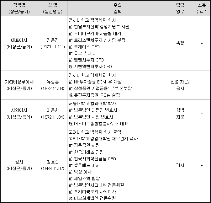 경영진은 M&A관련 자문경력이 다수 있습니다. 경영진의 과거 경력이 성공적인 합병을 보장하지는 않지만 참고할 만한 자료입니다.