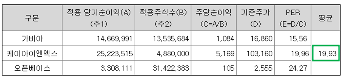비교기업은 가비아, 케이아이엔엑스, 오픈베이스이며 이들 기업의 평균 PER은 19.93입니다.