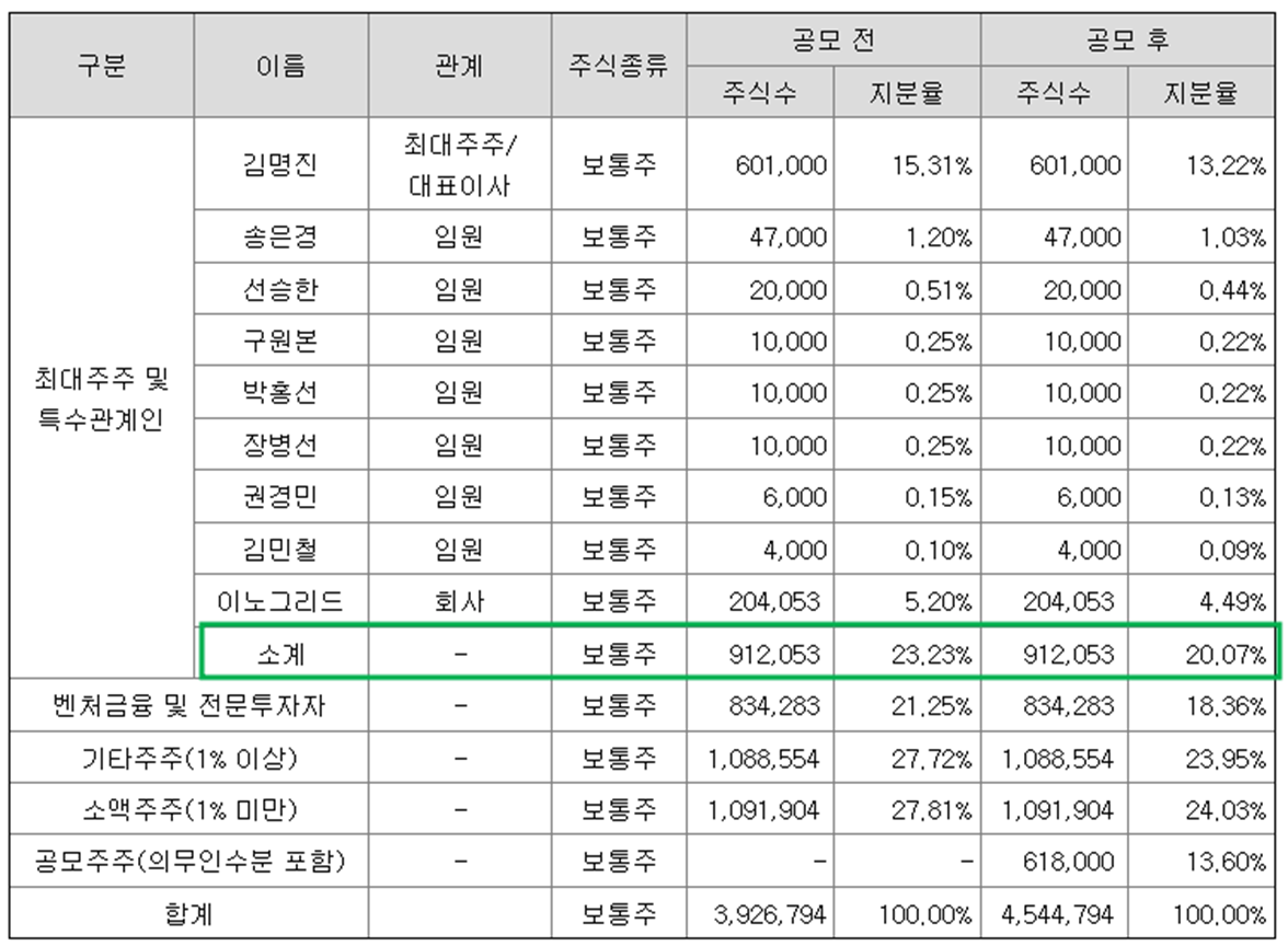 최대주주는 개인이며 약20% 지분을 가지고 있습니다. 최대주주가 상장기업인 경우 공모주의 기대감에 따라 최대주주의 주가가 급격히 상승하는 경우가 있습니다 필옵틱스와 LS머티리얼즈 상장 사례에서 확인할 수 있습니다. 최대주주가 상장기업인 경우 모기업의 주가상승에서도 수익을 낼 수 있으니 잘 살펴보시기 바랍니다.