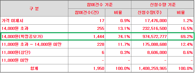 기관의 수요예측 신청가격 분포를 살펴보면 신청수량 기준으로 14,000원이 69.2%로 가장 많았으며 14,000원 초과가 16.5%로 두번째로 많았습니다.