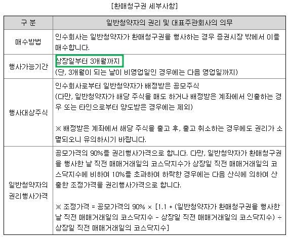 해당 공모주는 상장일부터 3개월까지 환매청구권이 부여되었습니다.