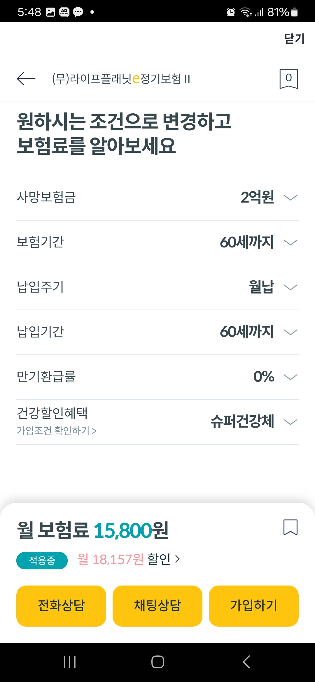 조건은 동일하며 슈퍼건강체로 할인받은 경우 월15,800원 입니다.