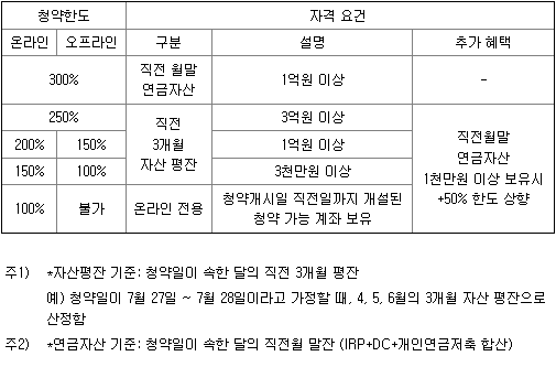 5. 청약한도 300% : 직전 월말 연금자산이 1억원 이상인 경우