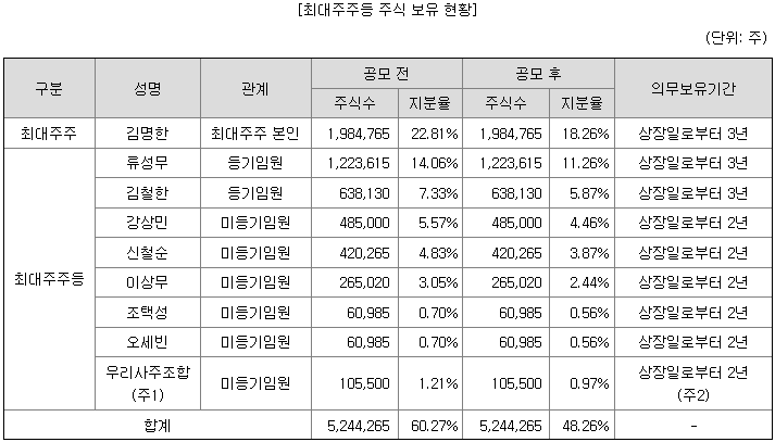 최대주주는 개인이며 최대주주등을 모두 포함해 약60% 지분을 가지고 있습니다. 최대주주가 상장기업인 경우 공모주의 기대감에 따라 최대주주의 주가가 급격히 상승하는 경우가 있습니다 필옵틱스와 LS머티리얼즈 상장 사례에서 확인할 수 있습니다. 최대주주가 상장기업인 경우 모기업의 주가상승에서도 수익을 낼 수 있으니 잘 살펴보시기 바랍니다.