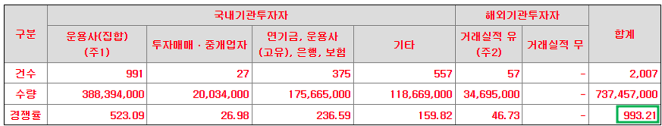 기관 수요예측 경쟁률은 993:1이며, 참여기관은  2,007개의 기관이 참여했습니다.