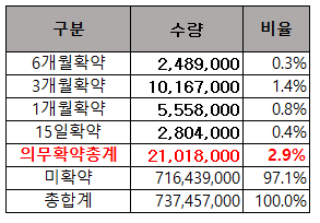 의무확약 비율은 2.9%입니다. 6개월 확약은 0.3%, 3개월 확약 1.4.%, 1개월 확약 0.8%,  15일 확약 0.4%입니다. 확약비율이 가장 많았던 개월수는 3개월 확약입니다.
