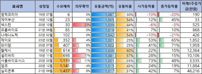 | 종목명 | 기관 경쟁률 | 의무확약 |