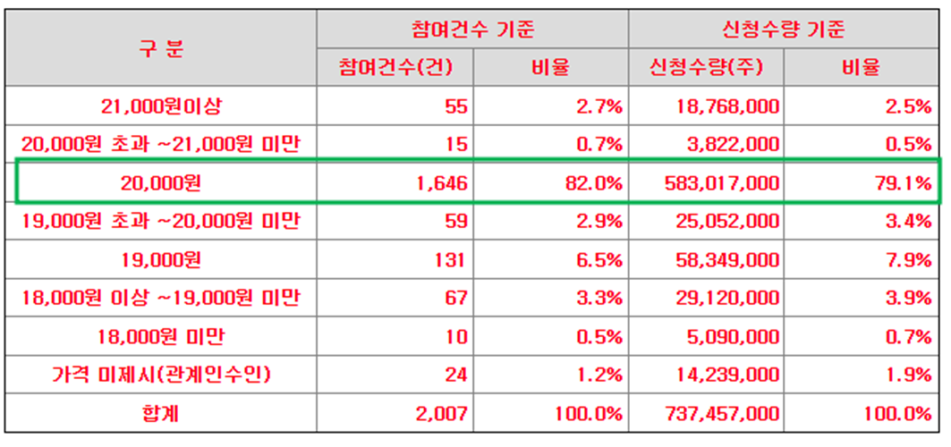 기관의 수요예측 신청가격 분포를 살펴보면 신청수량 기준으로 20,000원이 79.1%로 가장 많았으며 두번째로 19,000원이 7.9%로 많았습니다.