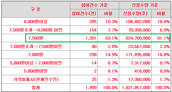 기관의 수요예측 신청가격 분포를 살펴보면 신청수량 기준으로7,500원이 61.1%로 가장 많았으며 두번째로 7,000원이 16.8%로 많았습니다.