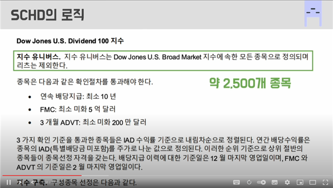SCHD의 종목선정 기준은 Dow Jones U.S. Dividend 100지수 종목 중 ①부채가 적음, ②수익률 높음,