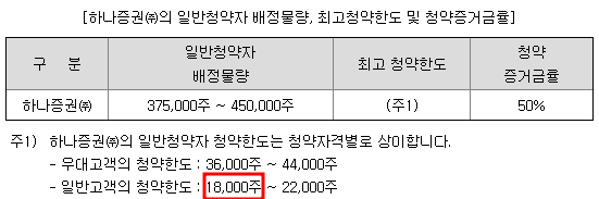 하나증권의 일반고객의 청약한도는 18,000주이며 희망공모가 상단기준 증거금으로는 135백만원입니다.